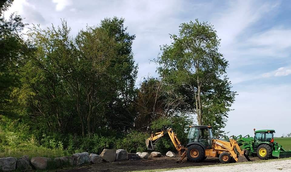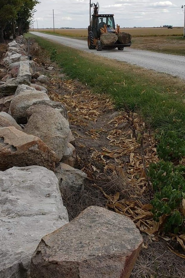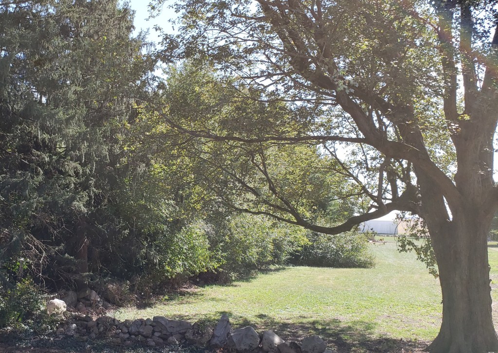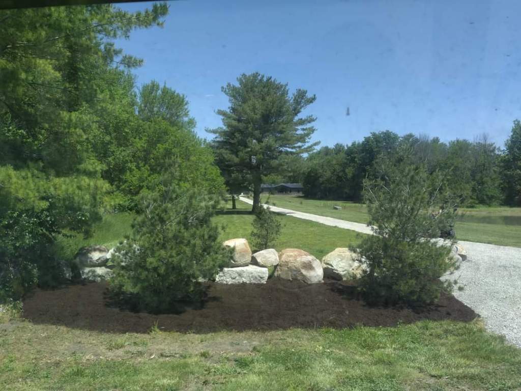 The rock wall may have acquired rocks from people dropping them off, for no other place to put them. Every single rock on the front rock wall was moved, mostly by hand and mostly by the two of us. After a rock went through the tractor mower, we knew we would have to do something different. There were giant boulders elsewhere on the property. Those were moved by our trusty backhoe. Now each boulder on the front wall weighs tons and won’t move anywhere.