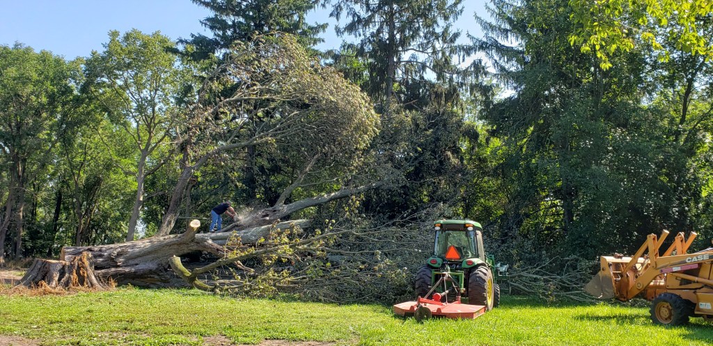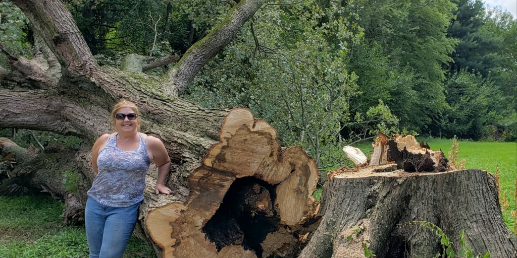 There was once a beautiful old tree on our property. It had seen several decades go by. We loved that old tree. If you take anything away from this post, let it be that if the tree could have stayed, it would have stayed. It was massive. We noticed that big chunks of the tree would appear underneath it. I would clean them up and then there would be more. It got so bad, that Mike didn’t want me under it. It was one of the tallest and oldest trees on the property. It was a BEAST!