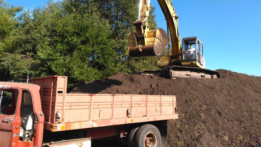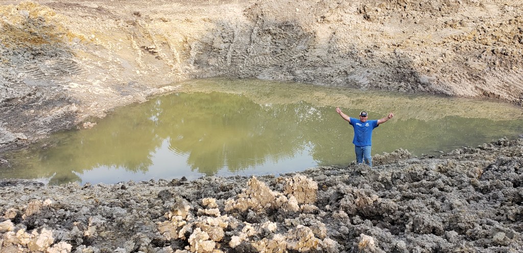 This was the first service that we paid for. They started digging and before too long they had a pretty deep hole. We decided on an acre ish size. As they continued to dig down, water started bubbling up. Soon they were pumping water out of it so they could dig.