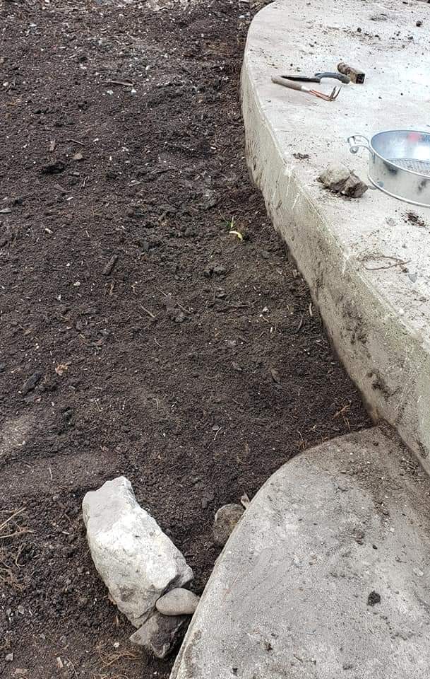 We were able to save one part of the old house. In the seventies the concrete porch was added to the house. I wanted to save it and use it in the garden. For the longest time it was where we sat to cool off and rest. The garden was designed around it. It sits behind our house now in the back. The soil was rough. It took hours and hours to sort through the crud for clean soil.
