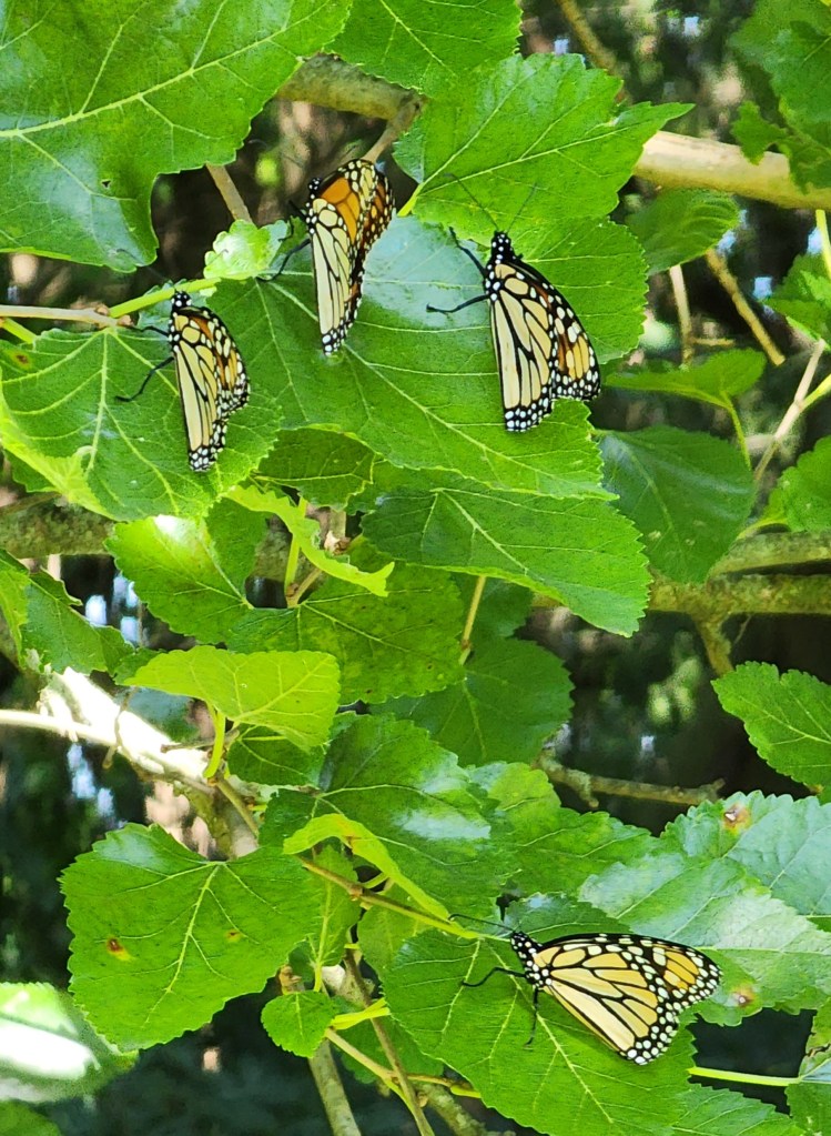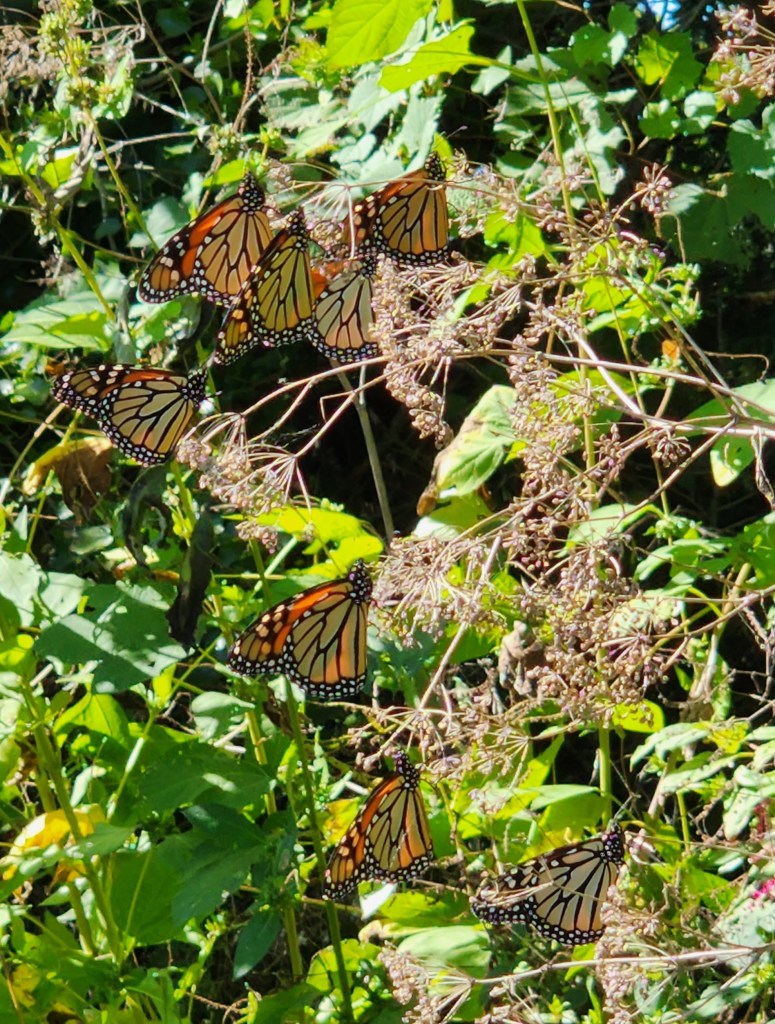 Mike and I noticed in the fall of 2019 there was a large amount of monarchs on the property. We didn’t really think anything about it. The next couple of years, we started to see more of a pattern. Mid to late September the monarchs counted into the hundreds. The only logical explanation was that they were stopping at the ranch along their migration path. It is so hard to describe and hard to capture with a picture. If you get too far away, in a picture they just look like leaves.