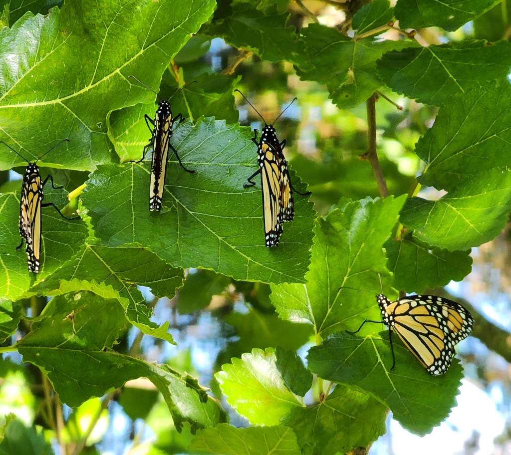 The monarchs seem to like the mulberry and pine trees when they are passing through.